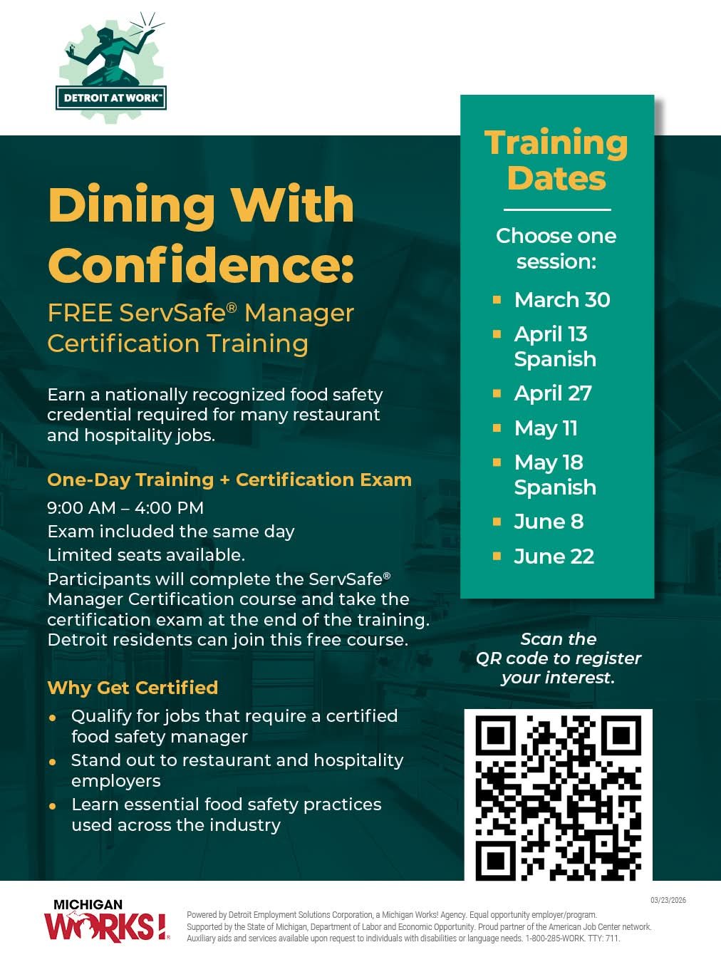 Interested in earning your ServSafe Certification at no cost? Michigan Works is offering a free, one-day training and certification exam this April through June for individuals looking to strengthen their food safety skills.